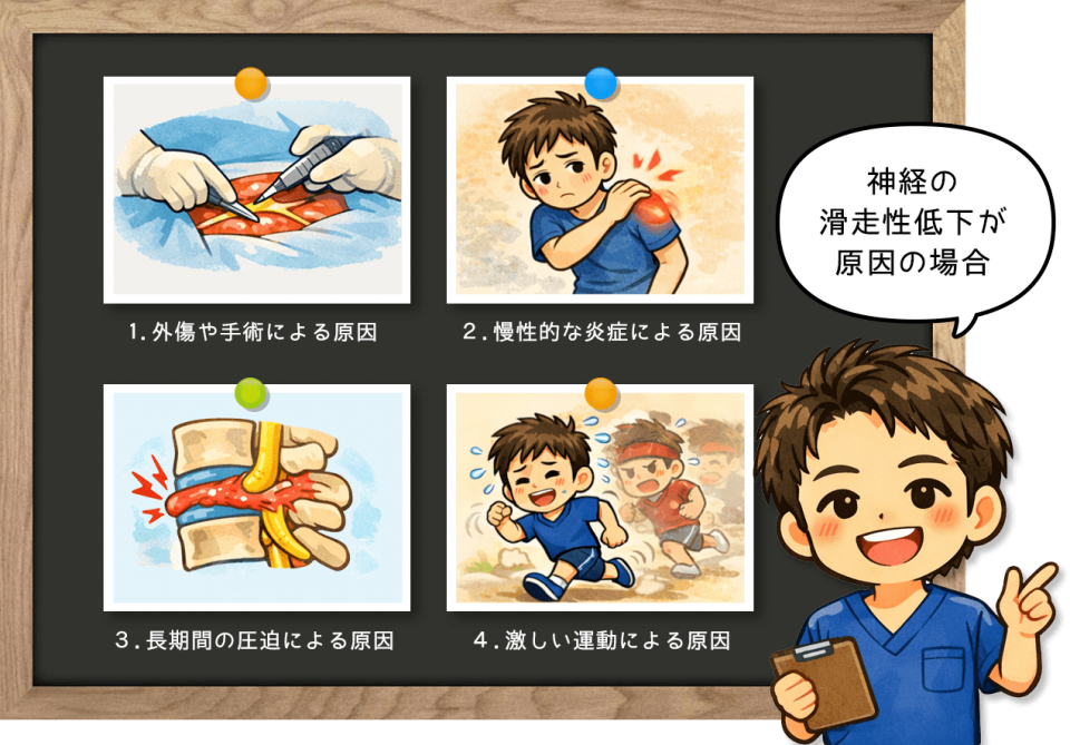 手術や過去の怪我が原因で神経の滑走性が低下することがあります。例えば、外科手術で神経が傷ついてしまったり、怪我の治癒過程で神経が圧迫を受けることが原因となります。