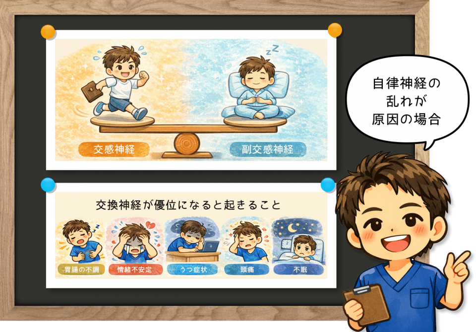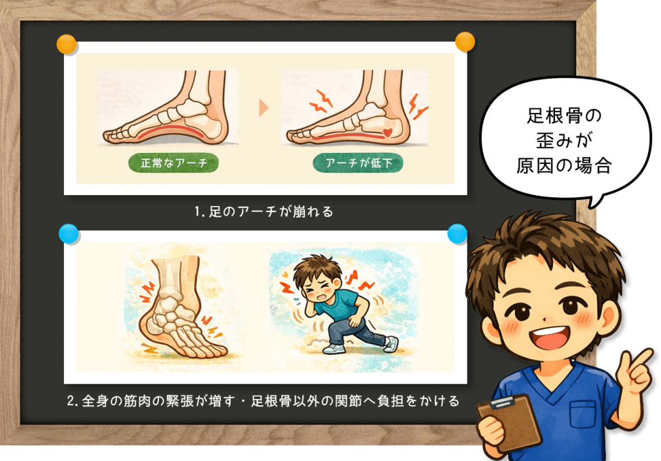 神経の滑走性の低下、足根骨の歪み、神経伝達の異常、自律神経の乱れ