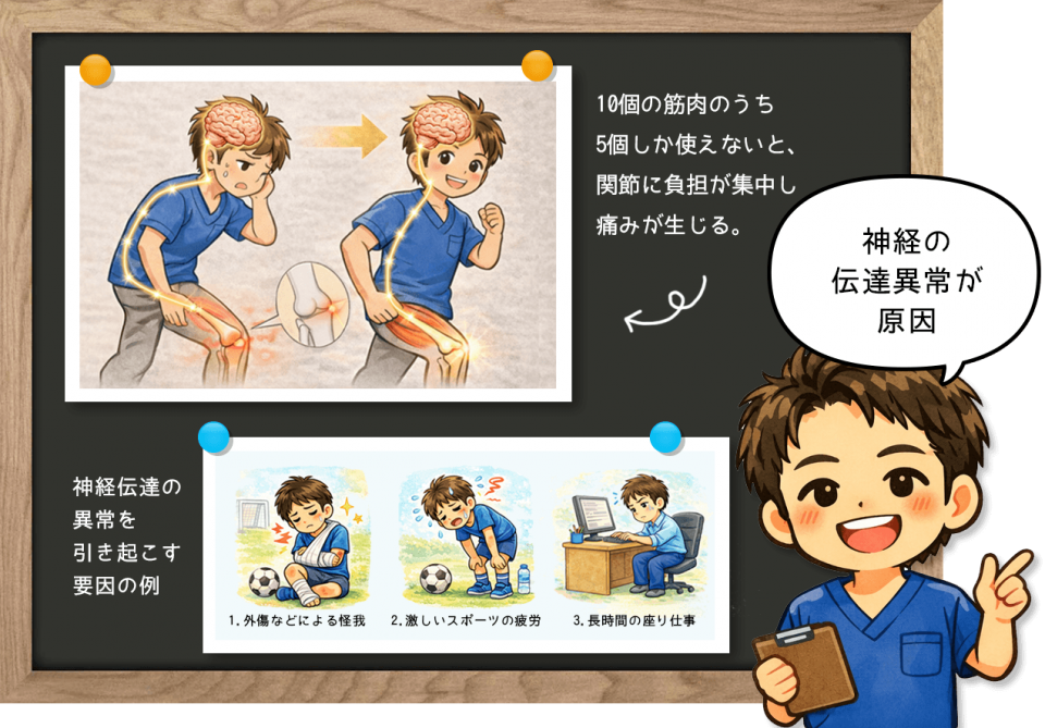 しかし、神経伝達の異常が起きると10個ある筋肉のうちの5個の筋肉しか使えない状態になってしまい、関節をこの5個の筋肉で動かそうとするので硬くなって痛みが出てきてしまいます。